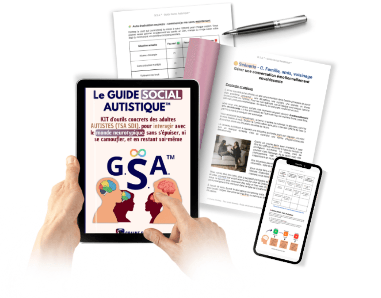 Le G.S.A.™ vous donne des outils concrets au travers de scénarios sociaux courants : des scripts adaptables, des stratégies éprouvées pour naviguer dans les situations sociales du quotidien sans perdre votre authenticité.