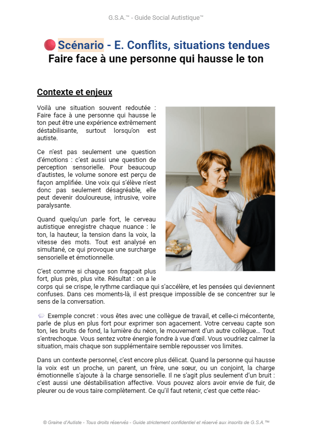 Chaque scénario suit une structure logique pensée pour les cerveaux autistes : contexte clair, défis spécifiques expliqués, scripts adaptables pour savoir quoi dire, points de vigilance, Outil de mise en pratique, espace de débriefing. Voici un aperçu des scénarios déjà disponibles (d'autres s'ajouteront avec les mises à jour). :