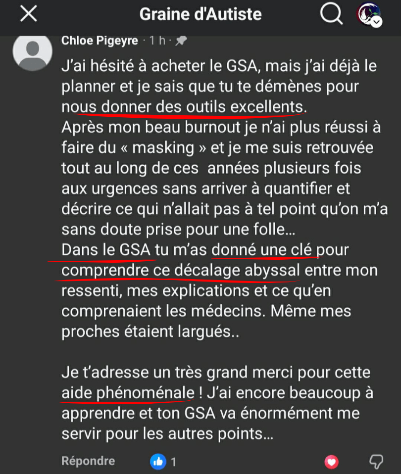 A la suite de cela, j'ai décidé de fonder la structure Graine d'Autiste qui a pour mission d’accélérer l’éducation et la sensibilisation du grand public afin de rattraper le retard énorme de la France autour de l’autisme sans déficience (TSA SDI) à l’âge adulte.